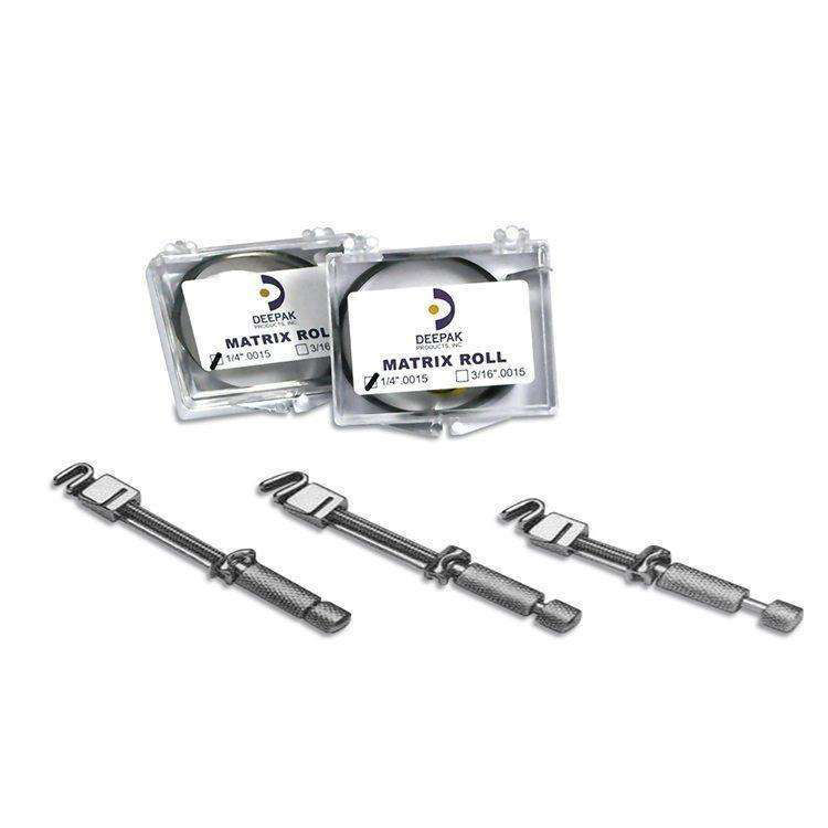 Los rollos y bandas de matriz son de acero inoxidable de alta calidad médica. No se desgarran bajo tensión y tienen los bordes lisos para contribuir a la comodidad del paciente. Las bandas en forma de T son de latón. Disponibles en un grosor de 0,04 mm. Vienen en rollos de 300 metros y 100 unidades por paquete.